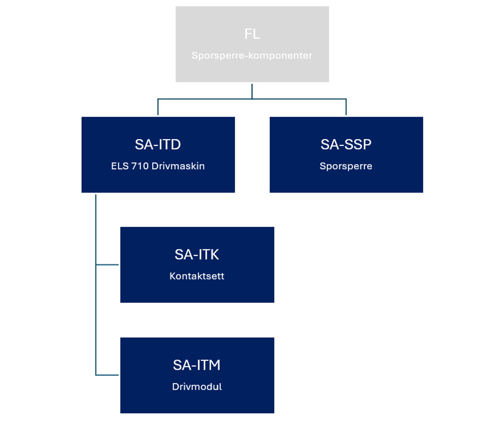 Figuren viser sporvekselkomponenter med en funksjonell lokasjon (FL) øverst. SA-ITD og SA-ITC er underliggende hovedobjekter. SA-ITD består av SA-ITK og SA-ITM. SA-ITC består av SA-ITL og EL-VEL.