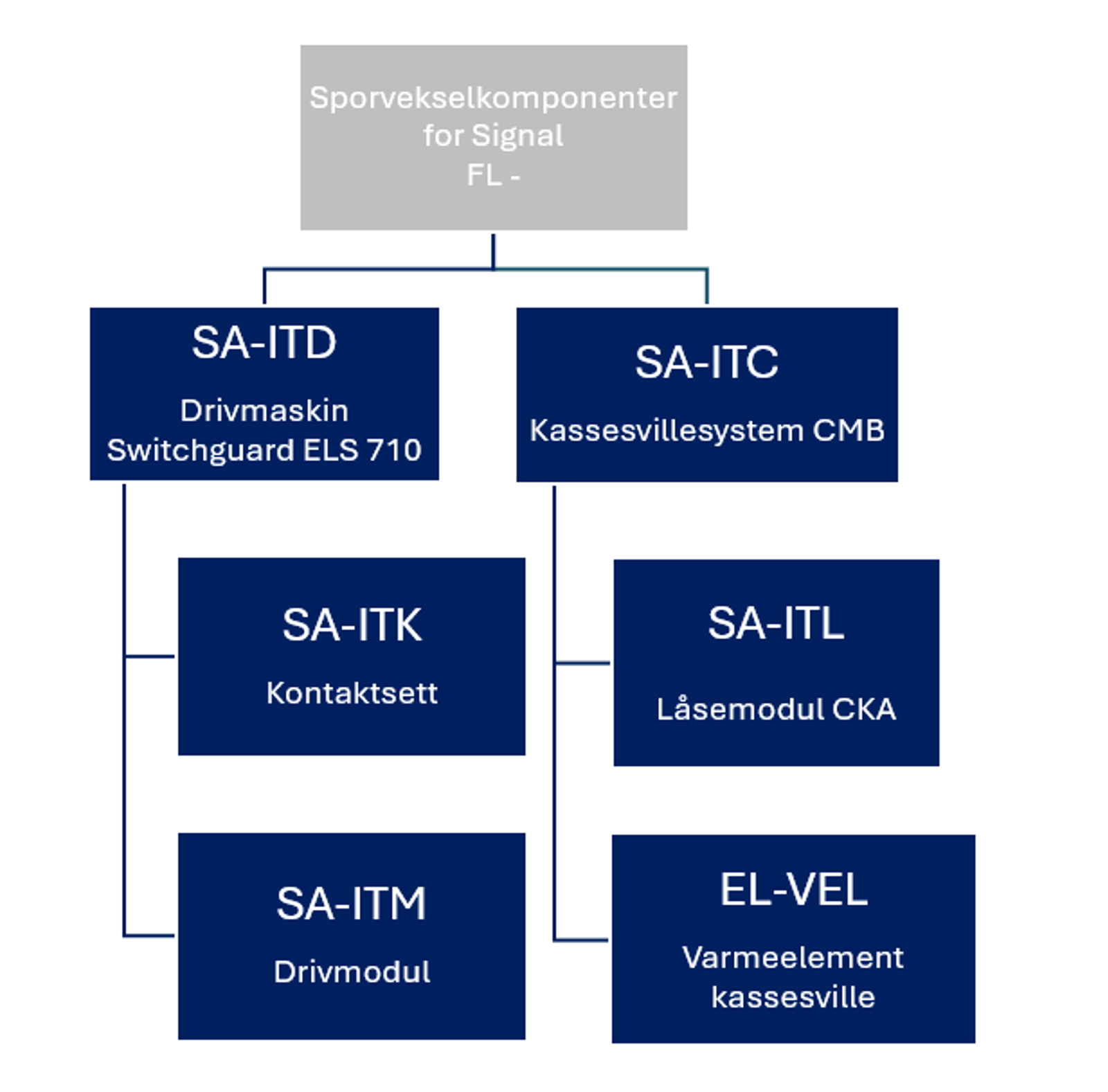 Figuren viser sporvekselkomponenter med en funksjonell lokasjon (FL) øverst. SA-ITD og SA-ITC er underliggende hovedobjekter. SA-ITD består av SA-ITK og SA-ITM. SA-ITC består av SA-ITL og EL-VEL.