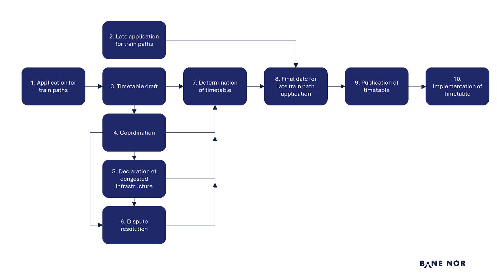 Train path applications in the annual capacity allocation must be submitted through Bane NOR’s system for applications in the annual capacity allocation (BEST-L BEST-LBane NOR's elektronic system for infrastructure capacity application (routes) in the yearly capacity allocation process.) in accordance with the set deadlines shown in Chapter 4.5.1.9 Schedule for the annual capacity allocation process.