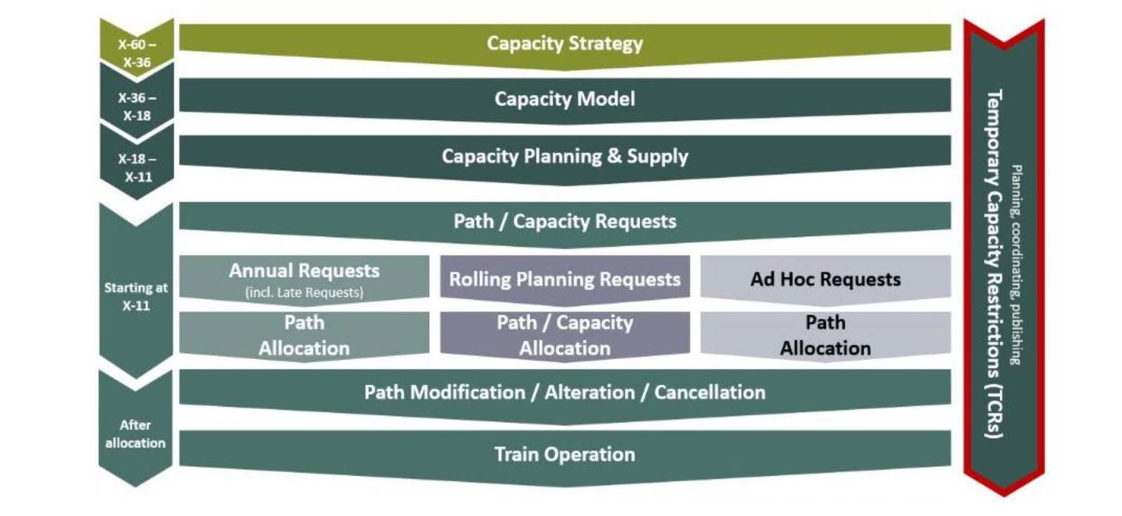The capacity allocation process follows two pathways, one for planning and allocating capacity for train paths and one for planning and allocating capacity for temporary capacity restrictions (TCR).