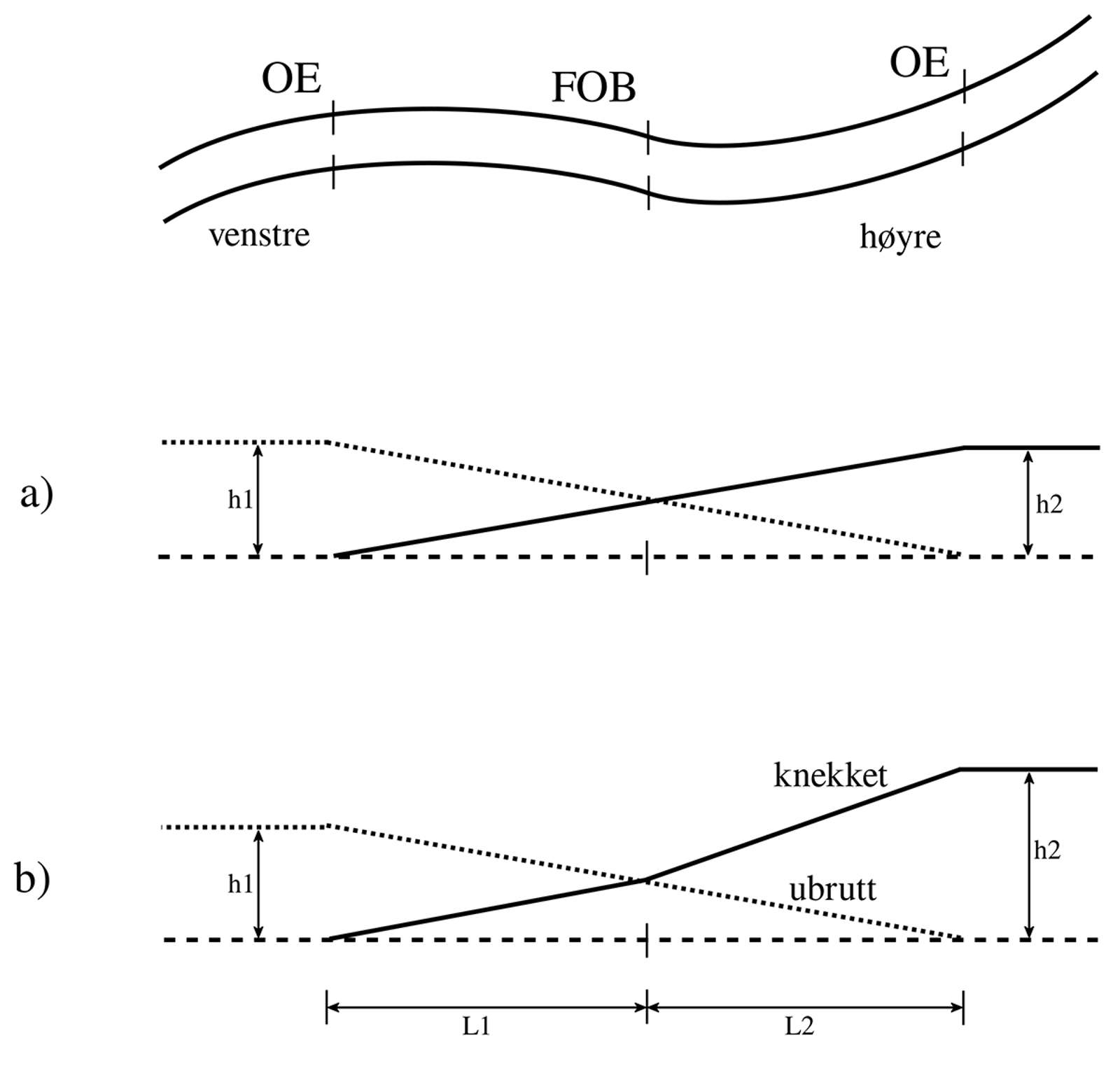 Det velges et sted fra OB punktet LX = 37.00 m. Ved dette stedet er overhøyden i overhøyderampen:
