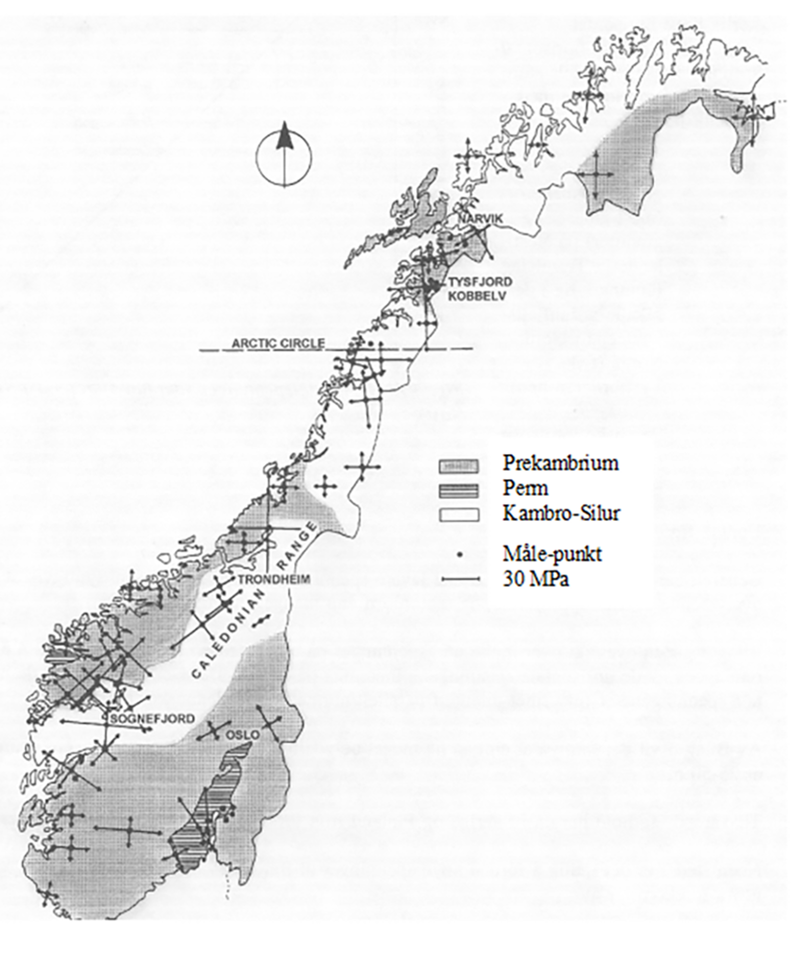 Figur 6 gir en grov oversikt over berggrunnsgeologien og over variasjoner i horisontalspenningsretningene i Norge.